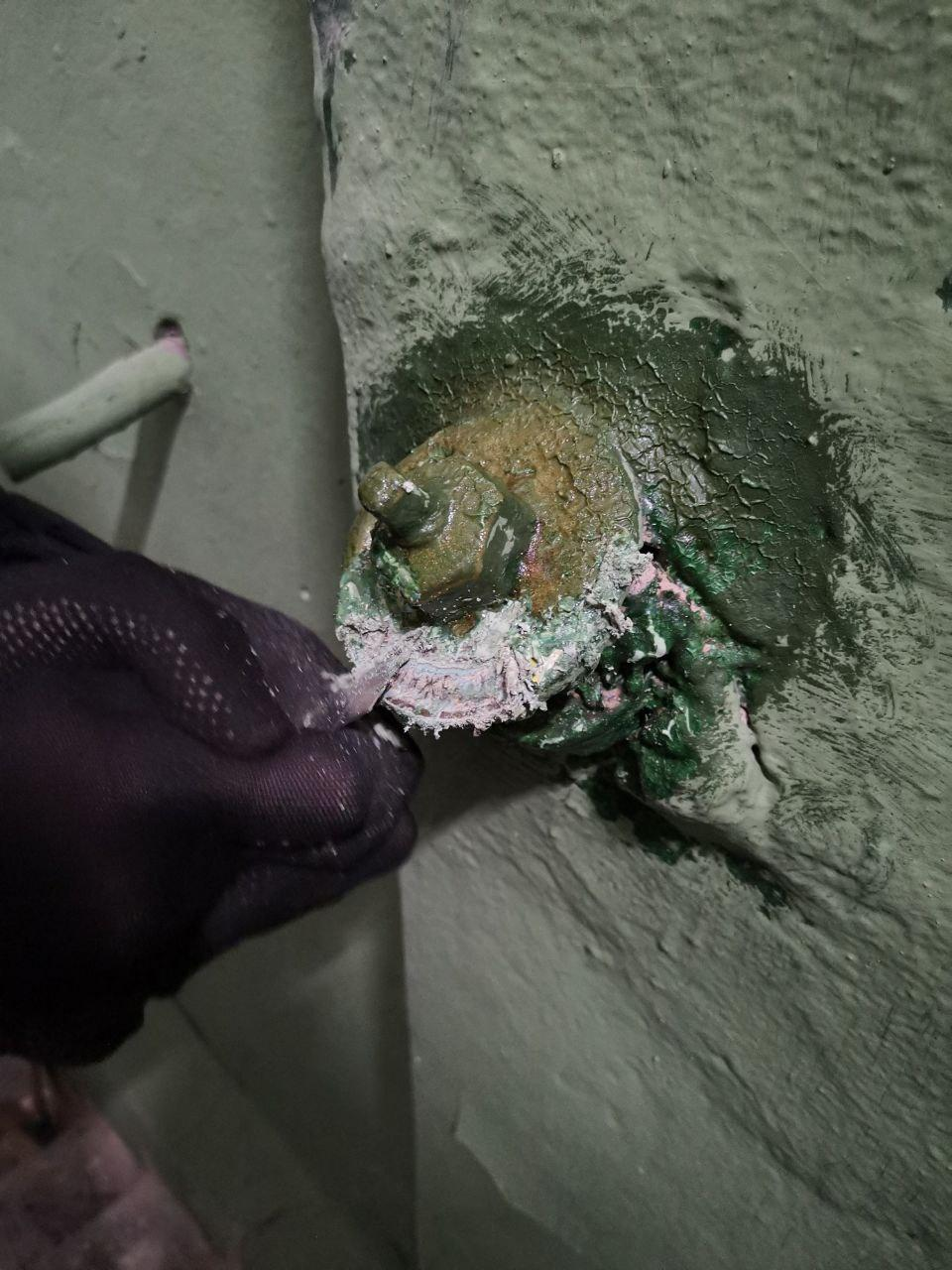 Интересным открытием в ходе работ стала расчистка крана на черной лестнице. Замазанный слоями краски, он уже потерял четкий рельеф. Было принято решение расчистить и его тоже: под растворенной краской сначала показались буквы, а затем и целые слова. Предположительно, это бронзовый кран для радиаторов отопления, произведенный в Технической конторе Роберта Эрнестовича Эрихсона (Москва).