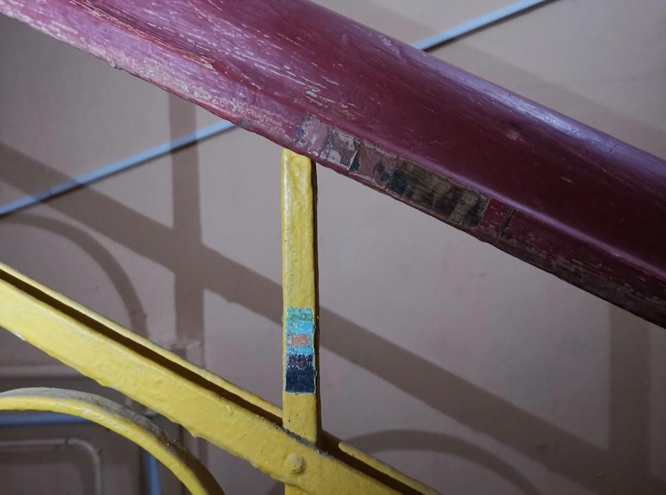 Также была проведена расчистка дореволюционных перил. Она показала, что поручни выполнены из дуба, изначально они были покрыты лаком (или воском), впоследствии на них наросло 5 слоев краски. Ограда же выполнена из металла, который первично был покрыт черной краской. Сегодня на них наслоения 7 красочных слоев.