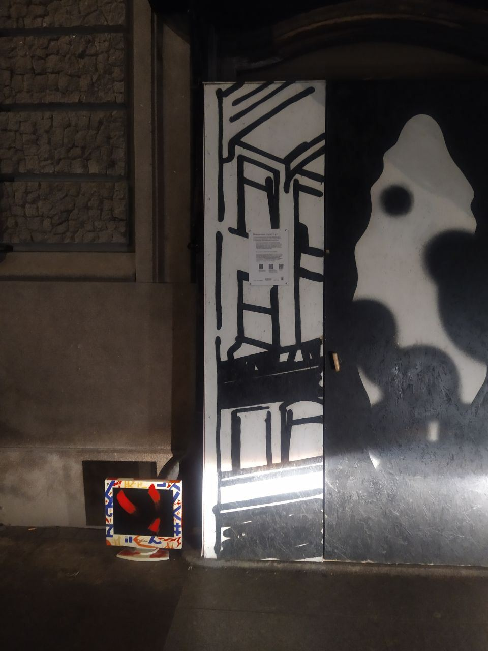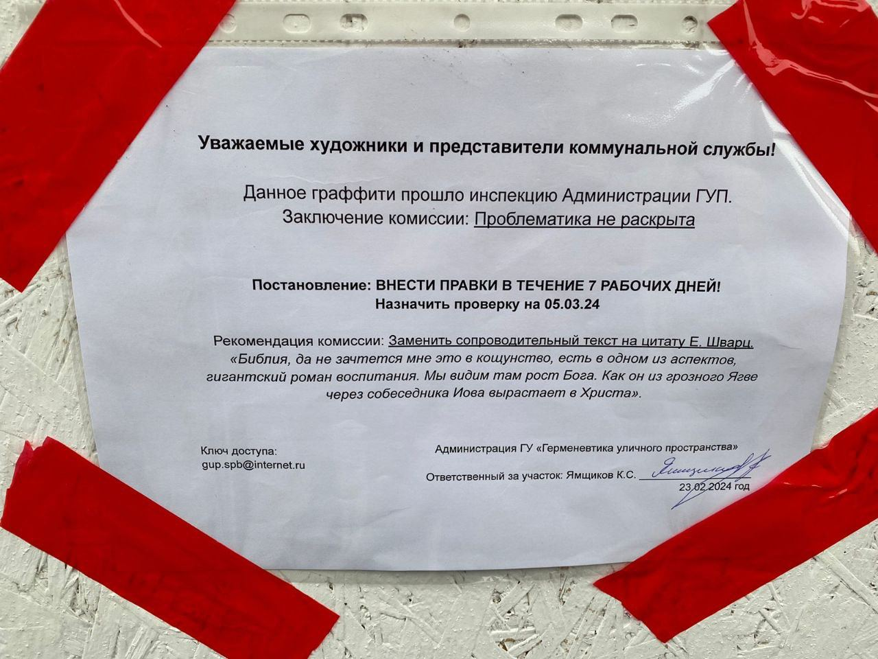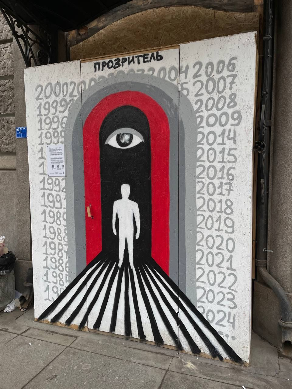 А спустя несколько дней на том же коробе появилась работа анонимного художника Прозритель, который в своих работах рефлексирует на темы творчества и социальных явлений, открыто выражая свою позицию.