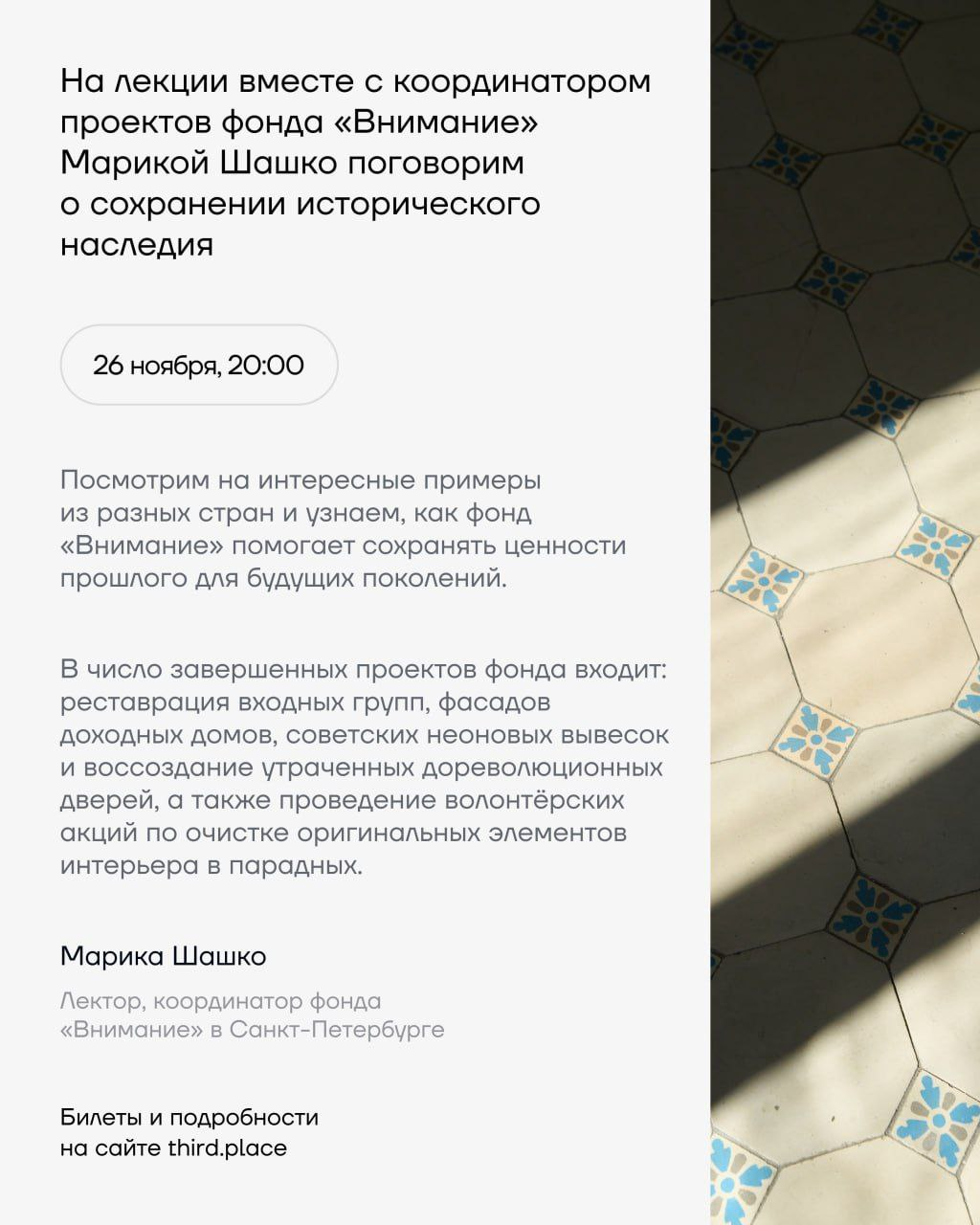 → 26 ноября (ср) в 20:00 в Третьем Месте — лекция «Сохранение культурного наследия: история, международный опыт и практика фонда «Внимание».
