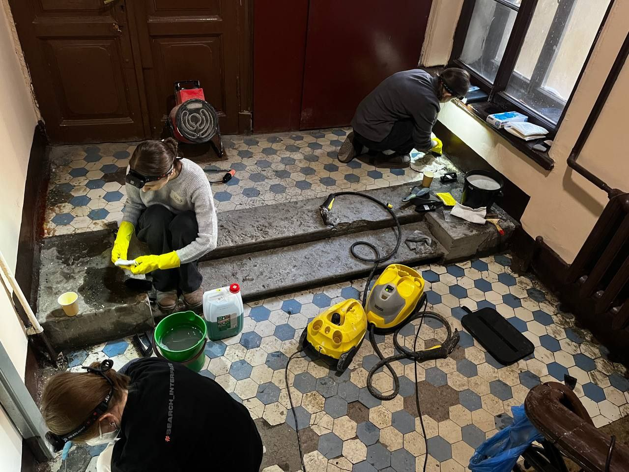 В субботу, 21 февраля, отмываем плитку в парадной бывшего доходного дома И. Я. Романова.