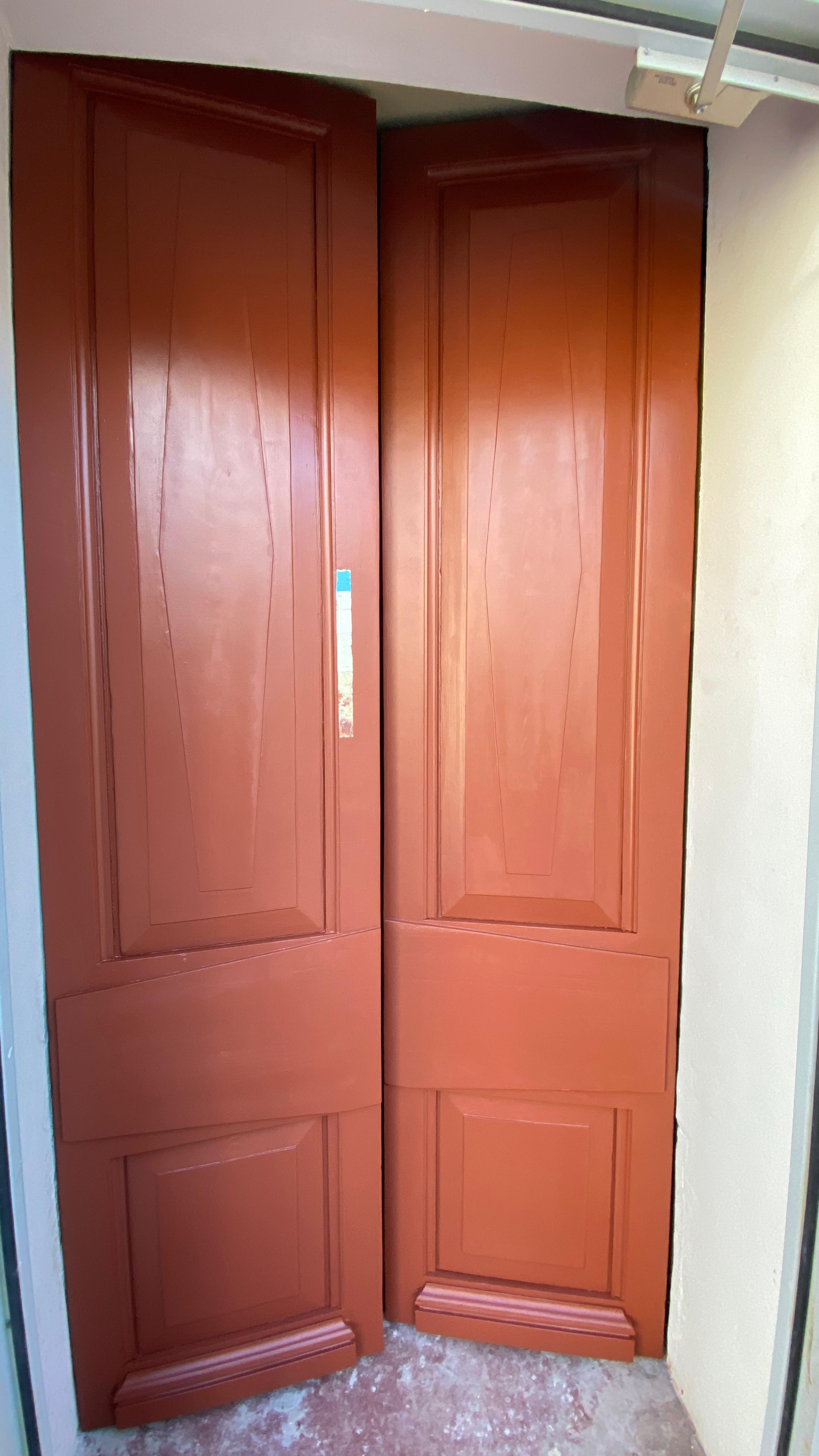 Сейчас жители хотят восстановить спасенную деревянную тамбурную дверь черного хода, за помощью они обратились к нам. Была проведена консультация с реставратором и составлена смета, благодаря которой определилась необходимая сумма на реставрацию – 70 тыс. руб. На данный момент дверь выкрашена синей краской; следует выяснить ее изначальный цвет и покрытие, а также установить, какие детали требуют замены.